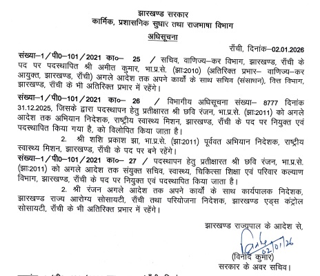 रांची। झारखंड सरकार ने 31 दिसंबर 2025 को किए गए भारतीय प्रशासनिक सेवा (IAS) अधिकारियों के तबादले में आंशिक संशोधन किया है। इस संबंध में कार्मिक, प्रशासनिक सुधार एवं राजभाषा विभाग की ओर से सोमवार को आधिकारिक आदेश जारी कर दिया गया है।